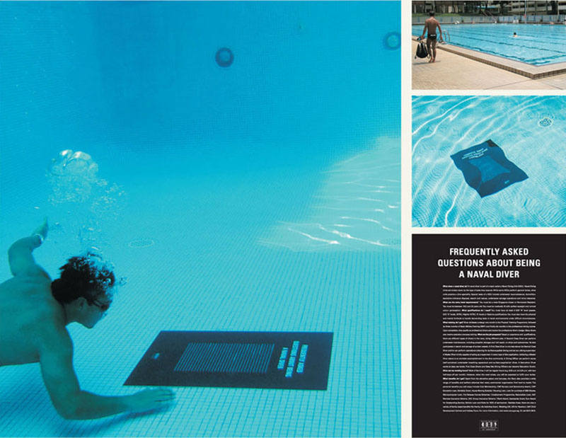 These Underwater boards detailed the duties, qualifications and benefits of being a naval diver with the Republic of Singapore Navy and placed at the bottom of public pools. The thing was swimmers were required to hold their breath and read the facts to then apply.